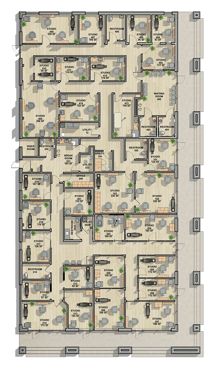 The Salon has 28 studios, two waiting rooms, and two washer dryer rooms. About 15 studios have ventilation of air by timer switches. Some of the studios have their own private entrance as well. There are also full laundry facilities and break rooms. Many studios have windows facing the outside streets, allowing you to place your own signage in the windows.